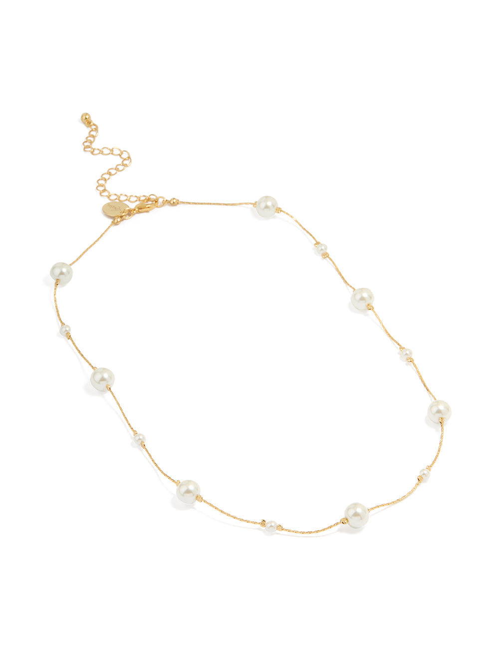 Add a touch of elegance to your bridal look with this Gold Plated Pearl Alternating Necklace. This stunning station necklace features a sleek gold-plated finish, perfectly offset by lustrous pearls arranged in an alternating design for a modern yet timeless feel. Ideal for brides seeking a refined accessory, it's lightweight and versatile enough to complement everything from flowing wedding gowns to chic evening dresses. Whether you're walking down the aisle or attending a formal occasion, this necklace is the perfect finishing touch. Pair it with pearl drop earrings or delicate gold jewellery for a polished, sophisticated look that will turn heads all day long.